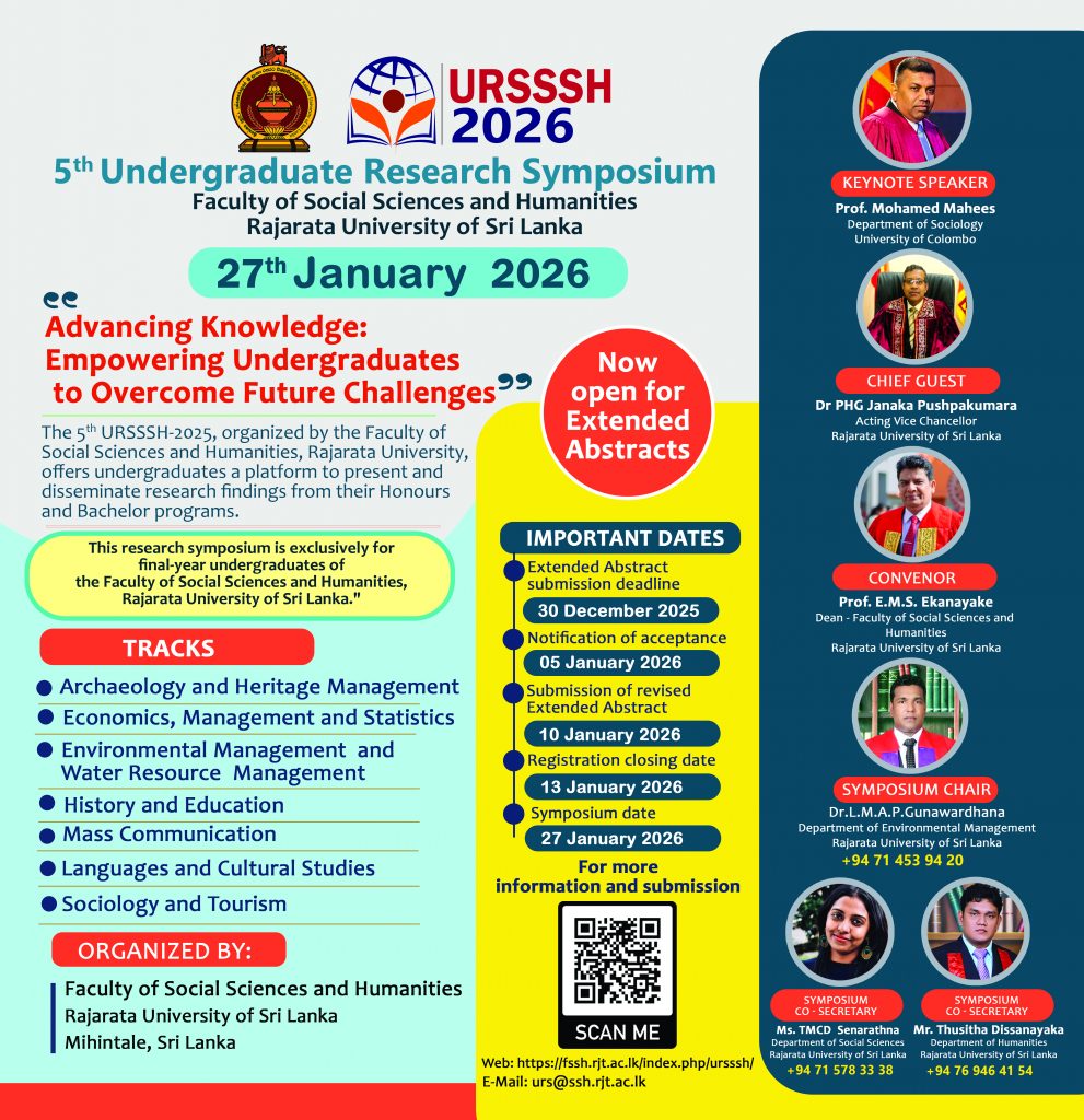 The 5th Undergraduate Research Symposium on Social Sciences and Humanities 2025 (URSSSH-2025), organized by the Faculty of Social Sciences and Humanities at Rajarata University of Sri Lanka, aims to provide a dedicated platform for undergraduates pursuing Honours and Bachelor degree programs across various disciplines within the faculty. While final-year students in these programs are required to conduct research and submit dissertations or reports as part of their degree completion, there has been no formal opportunity to present and disseminate their research findings.